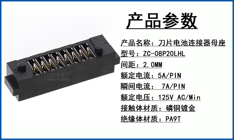 刀片电池连接器ZC-08P20LHL母座带柱双弹片 2.0间距8Pin